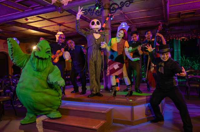 Kick things off with the signature “Oogie Boogie Bojito” welcome drink, and settle in for a frightfully delicious four-course menu featuring Vampire Blood Bisque and a decadent casket shaped dessert. Between courses, strike your best spooky chic poses for the Halloween Town photographer, take home a glow-in-the-dark Oogie Boogie ice cube*, and savor up close encounters with Jack, Sally and Oogie Boogie throughout the evening.